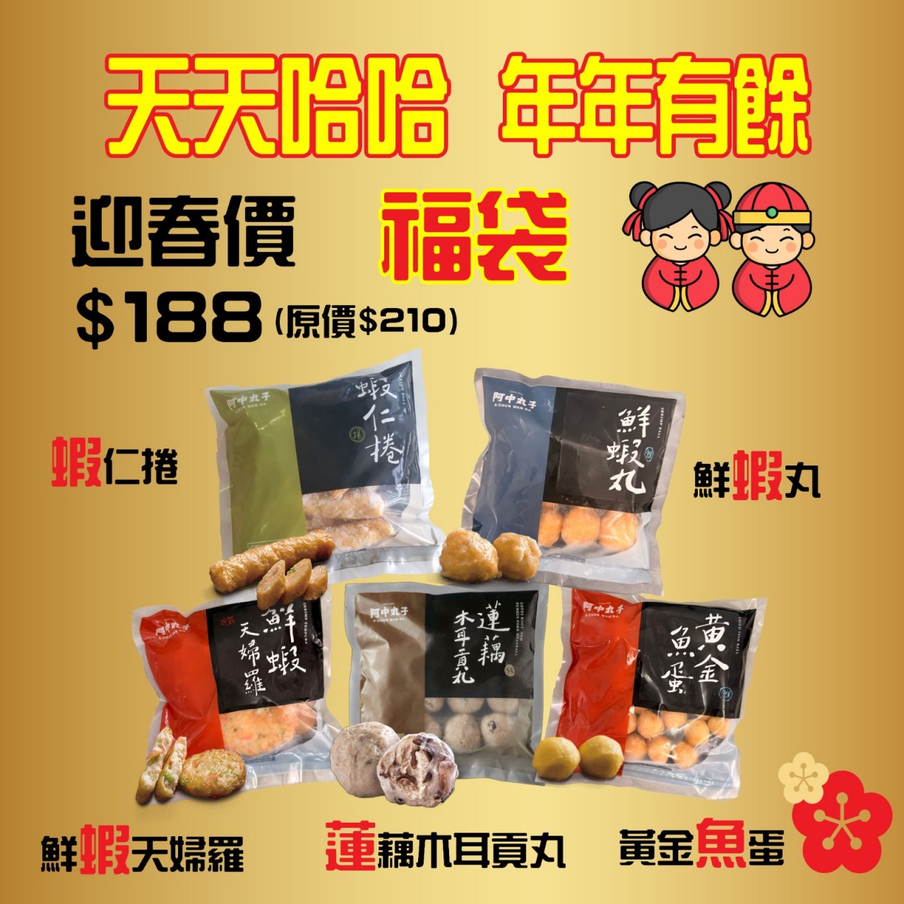 福袋包括:蝦仁捲、鮮蝦丸、鮮蝦天婦羅、蓮藕木耳貢丸、黃金魚蛋 以上各1包