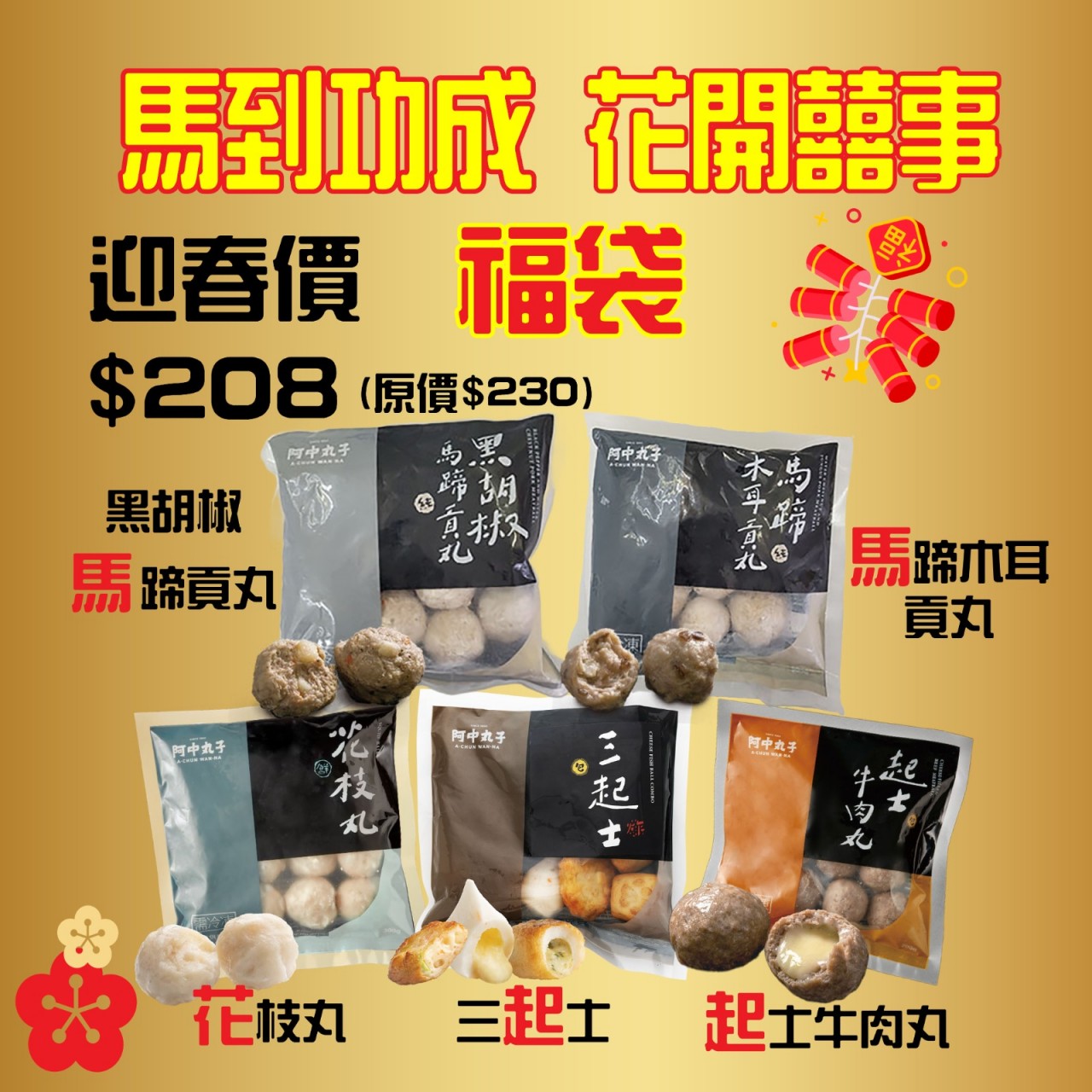 福袋包括:黑椒馬蹄貢丸、馬蹄木耳貢丸、花枝丸、三起士、起司牛肉丸 以上各1包